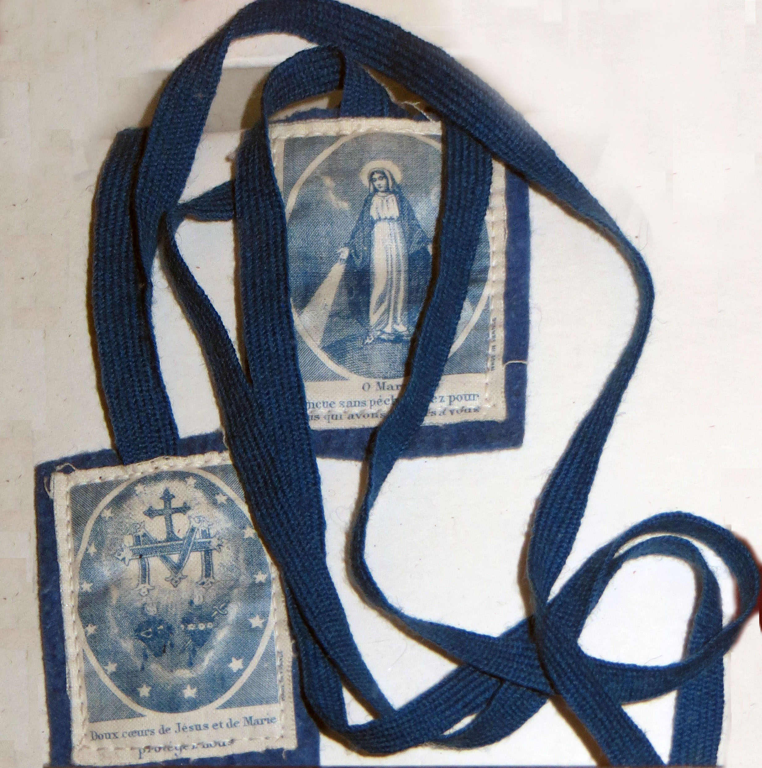 Texts: above: O Mary conceived with sin, pray for us who have recourse to you; below: Sweet hears of Jesus and Mary, protect us; on side: Made in France