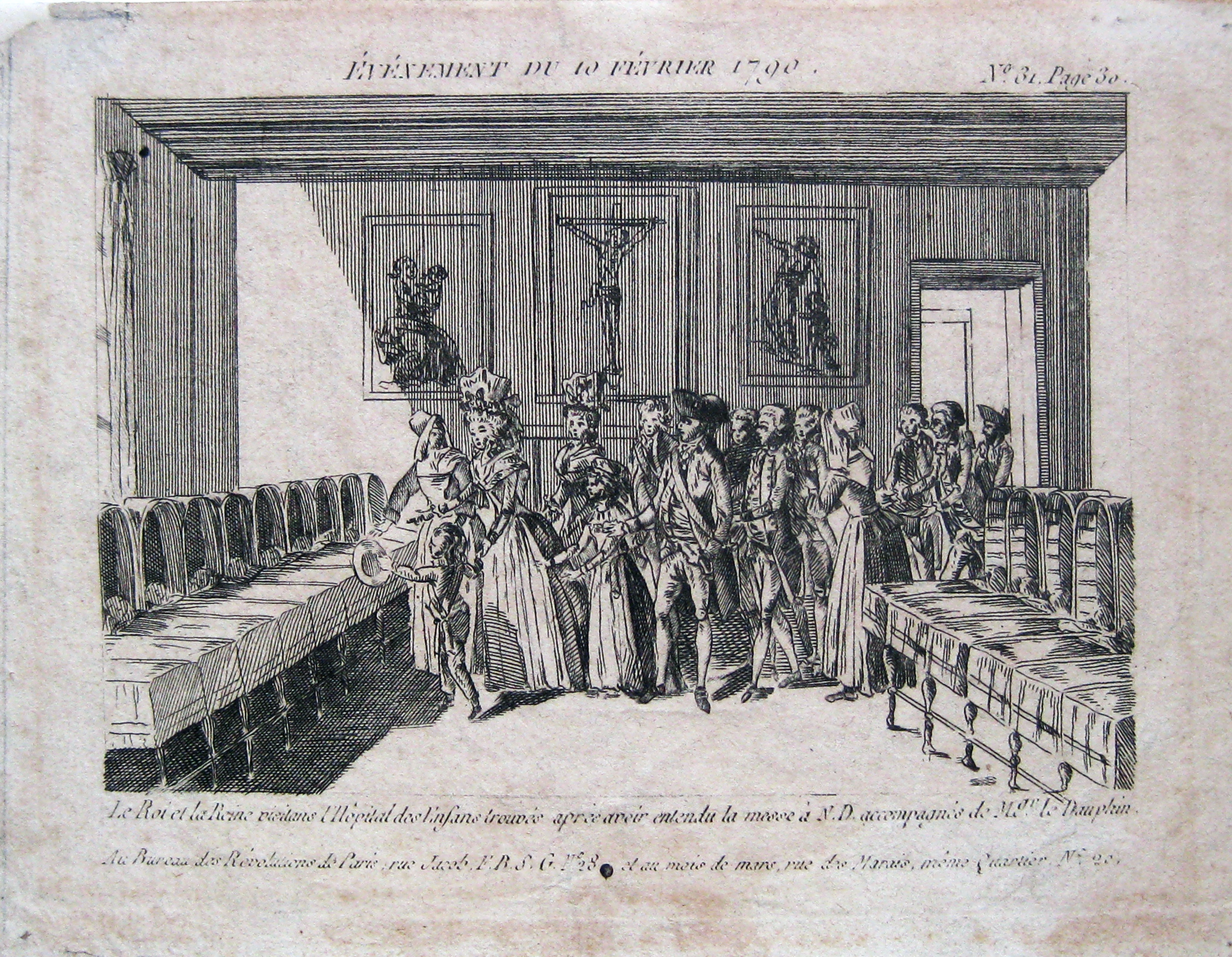 Text: The king [Louis XVI] and queen [Marie-Antoinette] visit the Foundling hospital after attending Mass at Notre Dame, accompanied by the dauphin; photo courtesy of Matthieu Bréjon