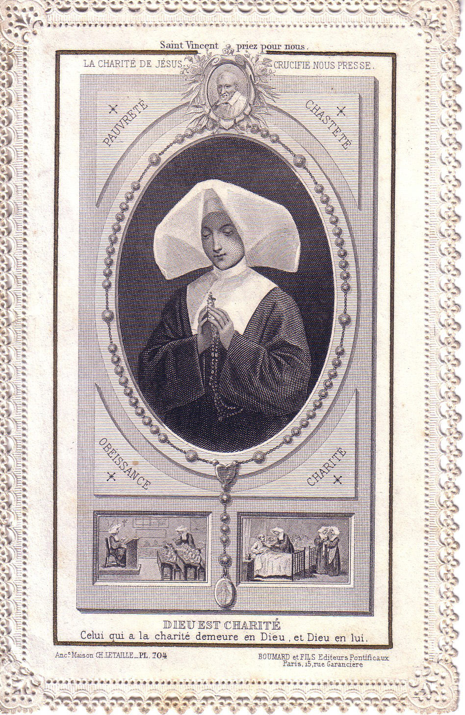 Lace; God is charity; he who has charity dwells in God and God in him. Rosary, 5 decades, with miraculous medal in place of crucifix; scenes of Sisters teaching, in hospital