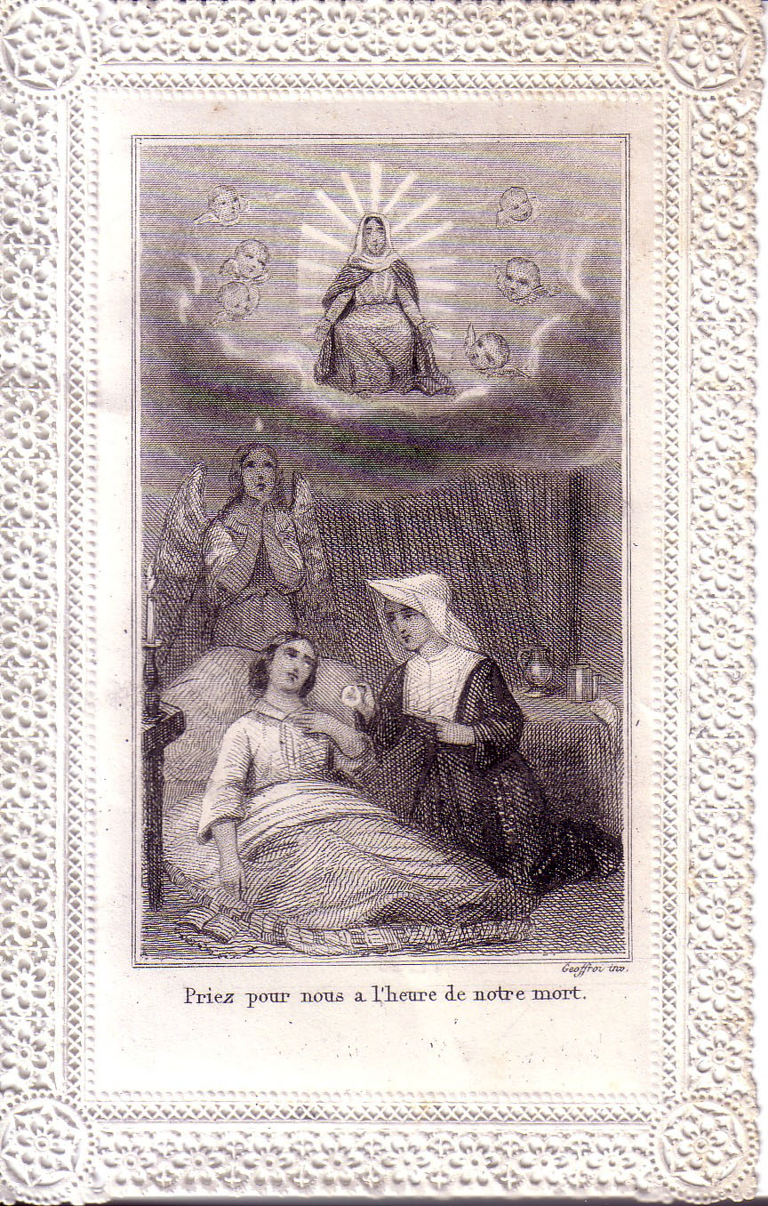 Pray for us at the hour of our death; Guardian angel, Virgin Mary, heads of cherubs; Sister holds a medal, maybe Miraculous Medal; lace border; DePaul University collection