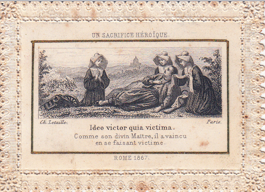 Latin text: He is a conqueror because he was a victim. French: Like his divine Master, he conquered when he became a victim. DePaul University collection