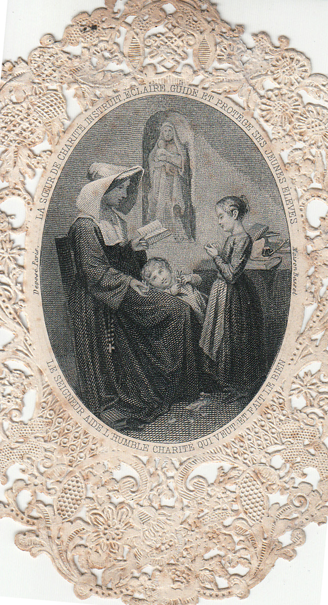 Text: The Sister of Charity instructs, enlightens, guides and protects her young students; The Lord helps humble charity that wishes and does what is good. DePaul University collection