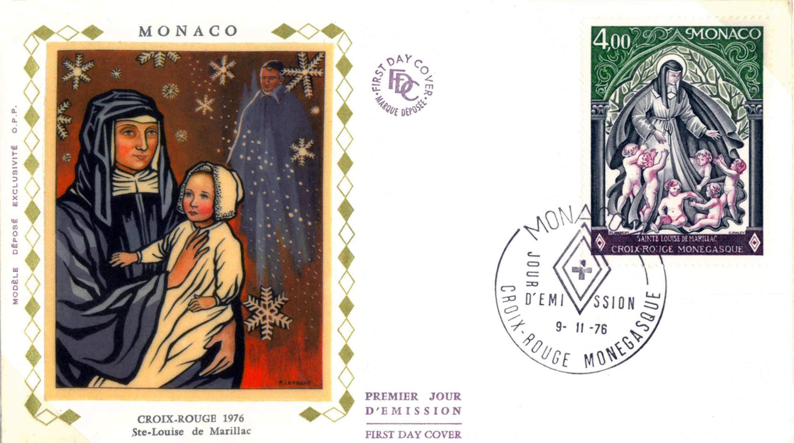Envelope: Louise de Marillac, holding child; Vincent de Paul in background; stamp: with children; commemorates Red Cross of Monaco