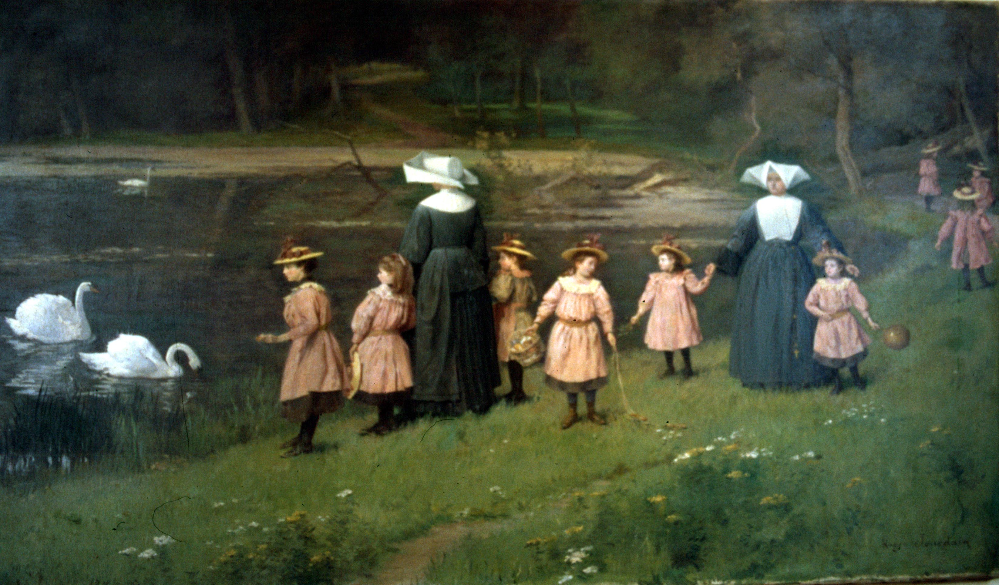 Daughters of Charity with orphan girls in a park; artist Roger Jourdain