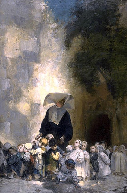 Sister with orphans in front of a church; artist: Jules Alex Patrouillard, end of 19th century; internet image, may be copyrighted