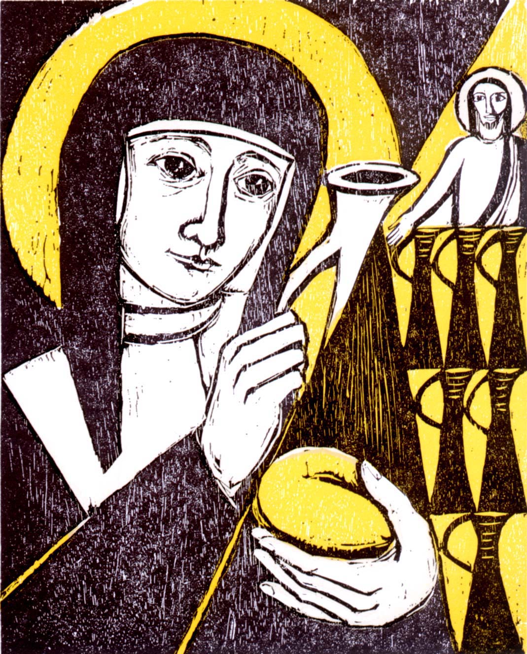 Louise de MARILLAC, Gravure en bois polychrome de Sr Primosa HERGET, Holzschnitt von Schwester Primosa, Untermarchtal Druck : Beuoner Kunstverlag, Beuron. Voir dessin de saint Vincent de la mme facture, en 10Dess.