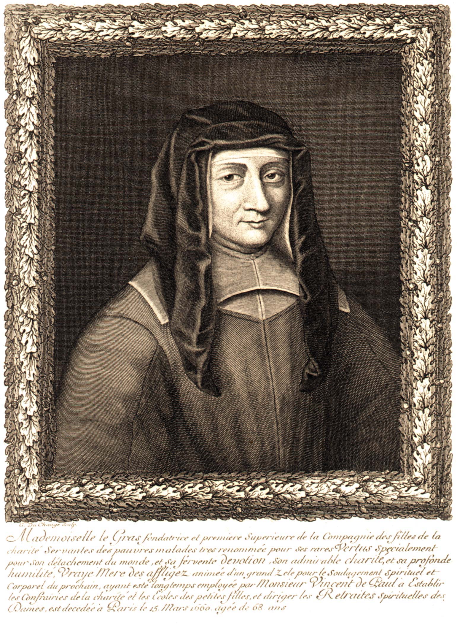 Text listing her works: Founder and first superioress; for sick poor; virtuous, humble; mother of the afflicted, spiritual and corporal aid; founded Confraternities of Charity under VdP, schools for girls, spiritual retreats; death date