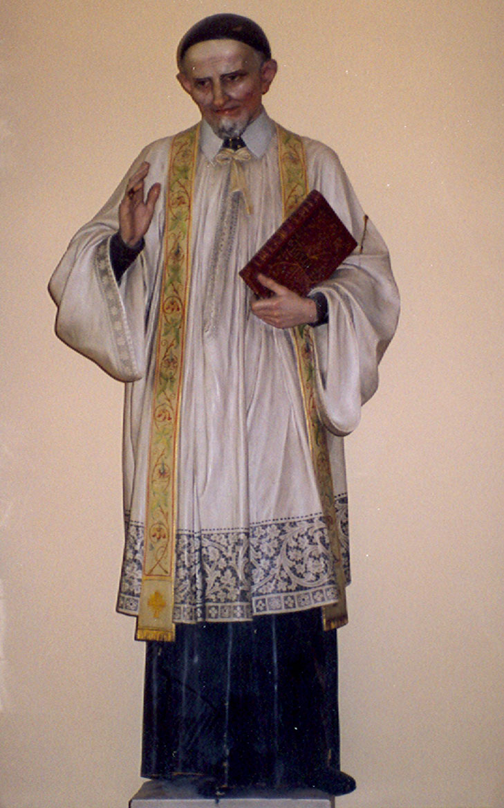 Vincent de Paul, in cassock, surplice, stole, holding a book, blesses. Original in Vincentian mother house, Graz