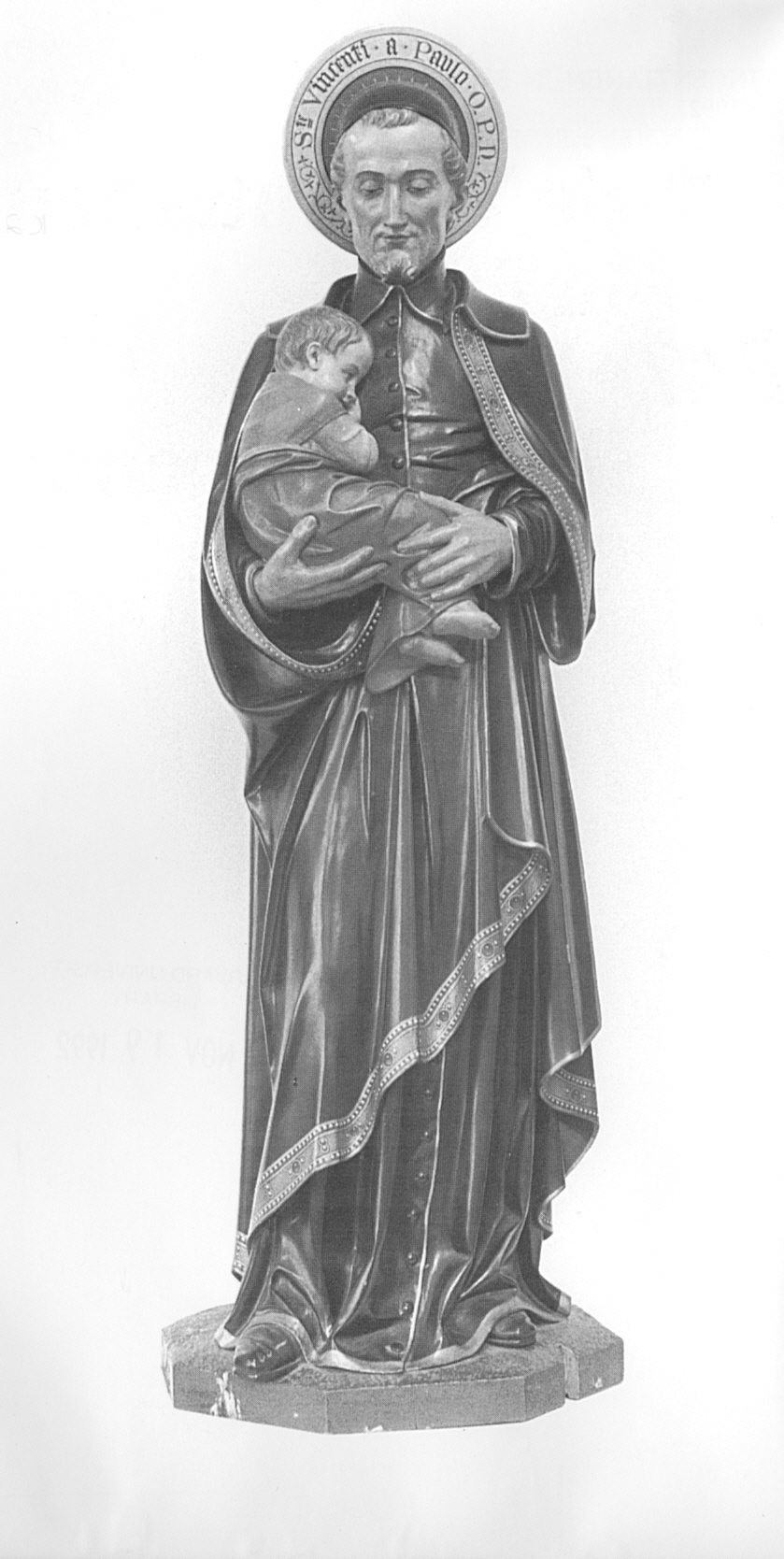 Photograph of a carved statue; Vincent de Paul in cassock and cape (with painted hem), cradling sleeping child; invocation in Latin (pray for us) around edge of halo; location of original unknown, but belonged to Society of St. Vincent de Paul