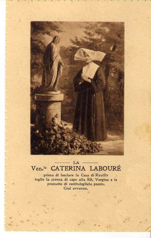 Catherine praying before the statue of Mary at the garden of Reuilly