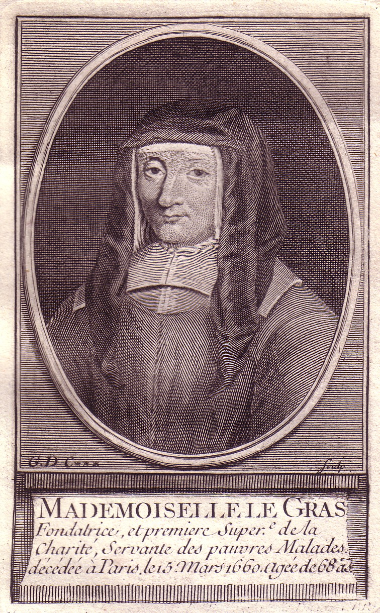French text: Mademoiselle le Gras, foundress and first superior of the Charity, servant of the sick poor, died at Paris, 15 March 1660, ag age 68 DePaul University collection