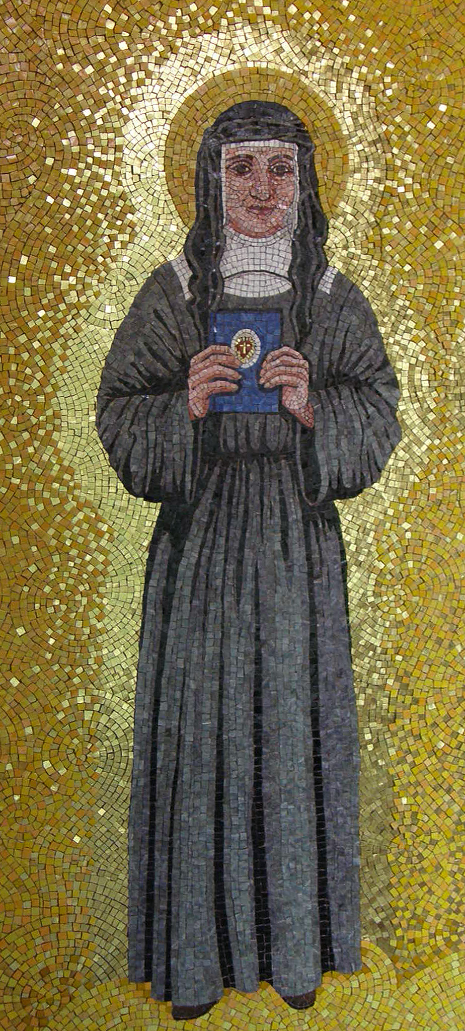 Louise de Marillac, holding book with seal of Daughters of Charity; detail from mosaic of Three Saints by Celia Berry: Vincent de Paul, Louise de Marillac, Elizabeth Ann Seton; original in Dell Children's Hospital, Austin