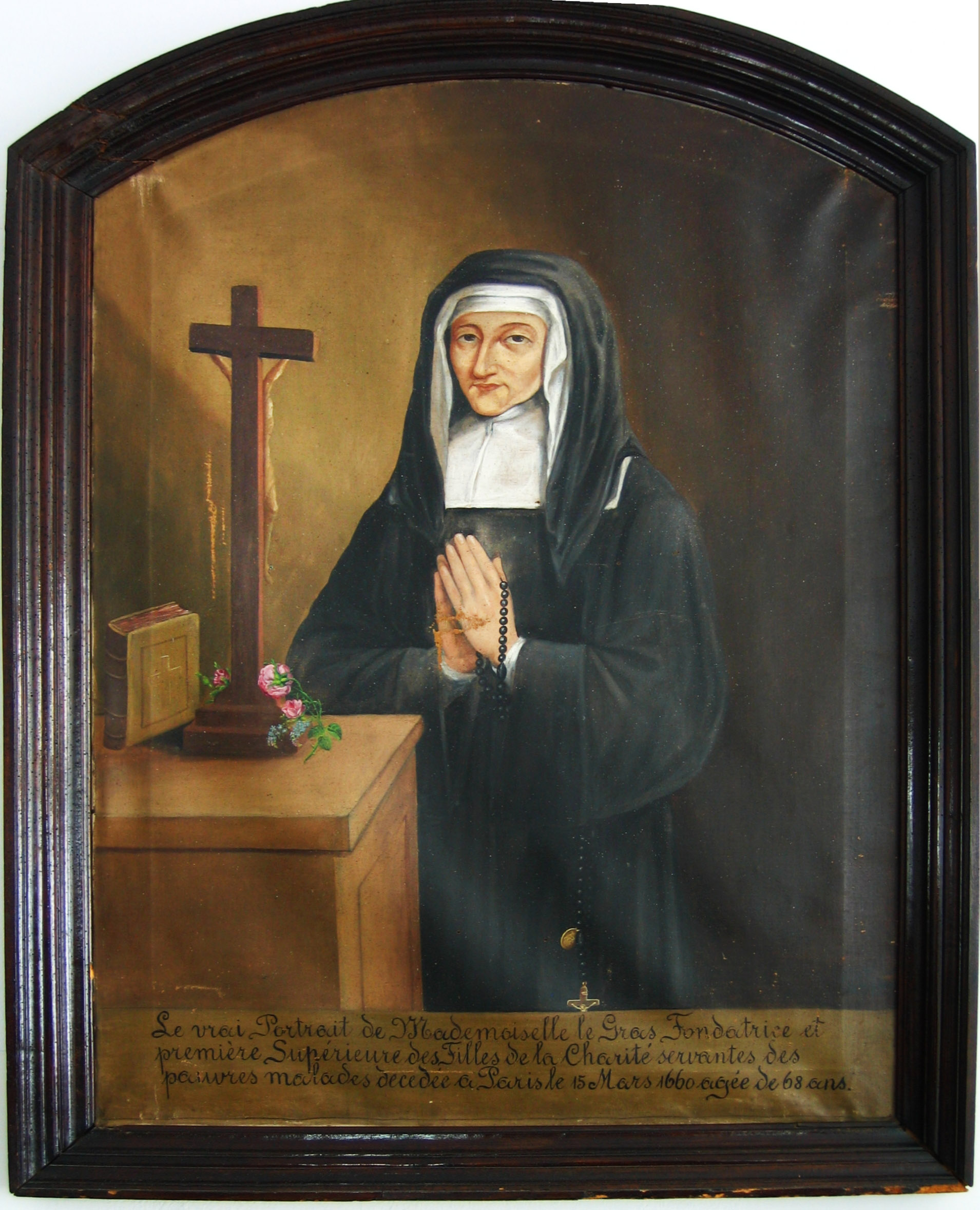 Original in Daughters of Charity mother house, Warsaw; text in French: "The genuine portrait of Mademoiselle Le Gras, foundress and first superioress of the Daughters of Charity, servants of the sick poor, who died in Paris in March 1660, at age 63."
