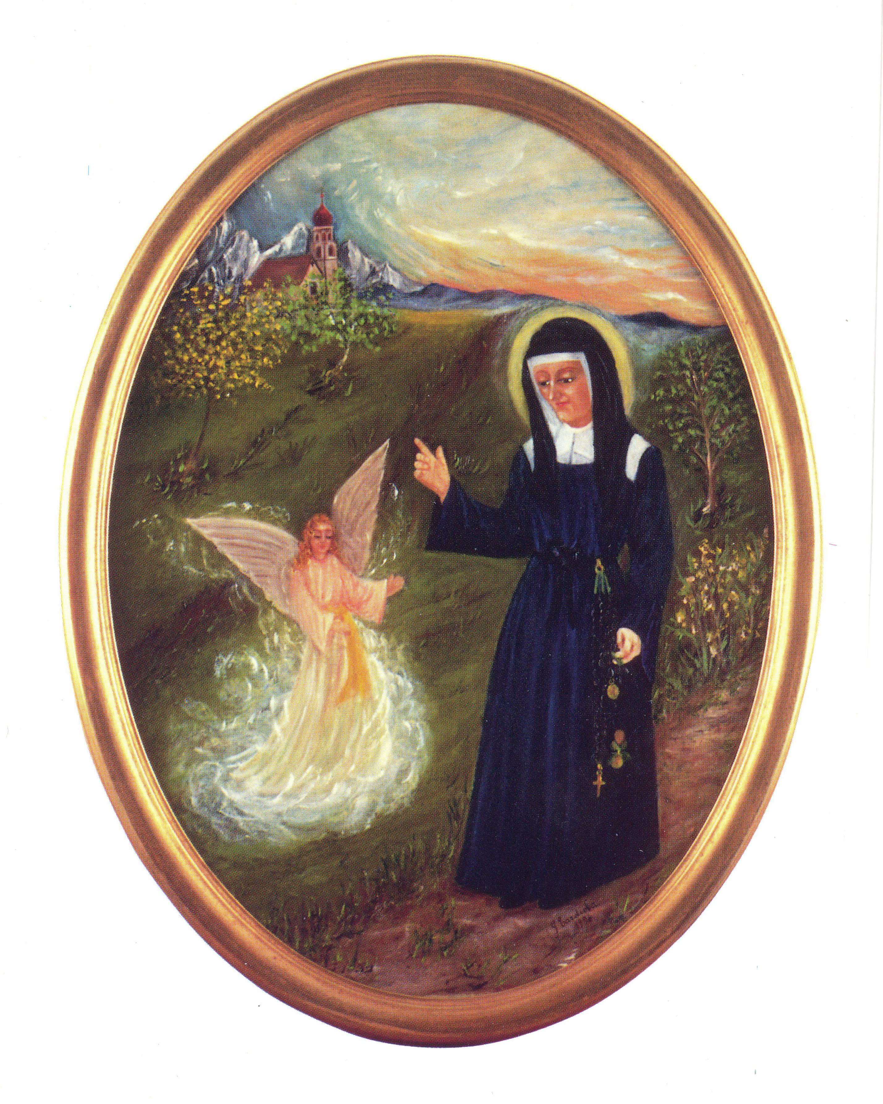 Louise de Marillac in blue habit, rosary and medals; outdoors, with angel; oval framed oil on canvas; artist: Sr. Giuseppina Tardiola, DC; in Daughters of Charity provincial house, Siena
