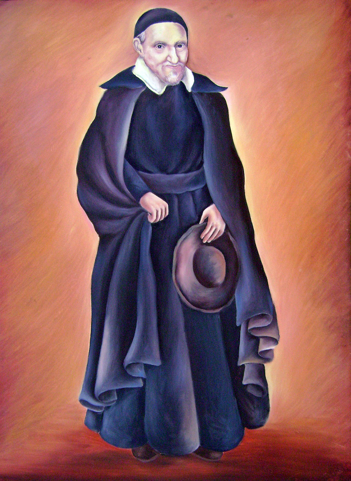 Vincent de Paul, standing, cassock (no buttons), cincture, cape, skullcap, holding round hat; in a Vincentian house in Lima