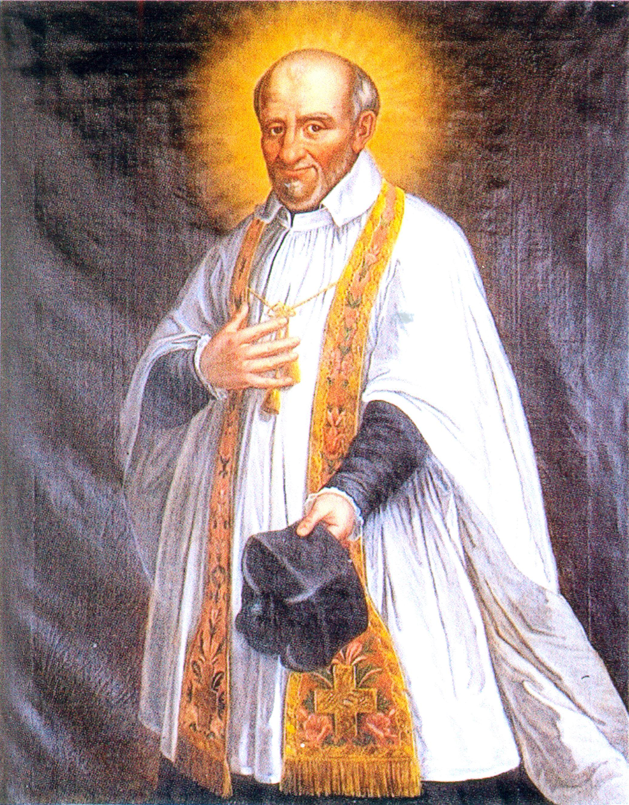 Vincent de Paul, standing, cassock, surplice, gold stole, holding biretta, gold aureole; copy of photograph; original in chapel of Hotel-Dieu, where Daughters of Charity served, 1700-1968. May be copyrighted.