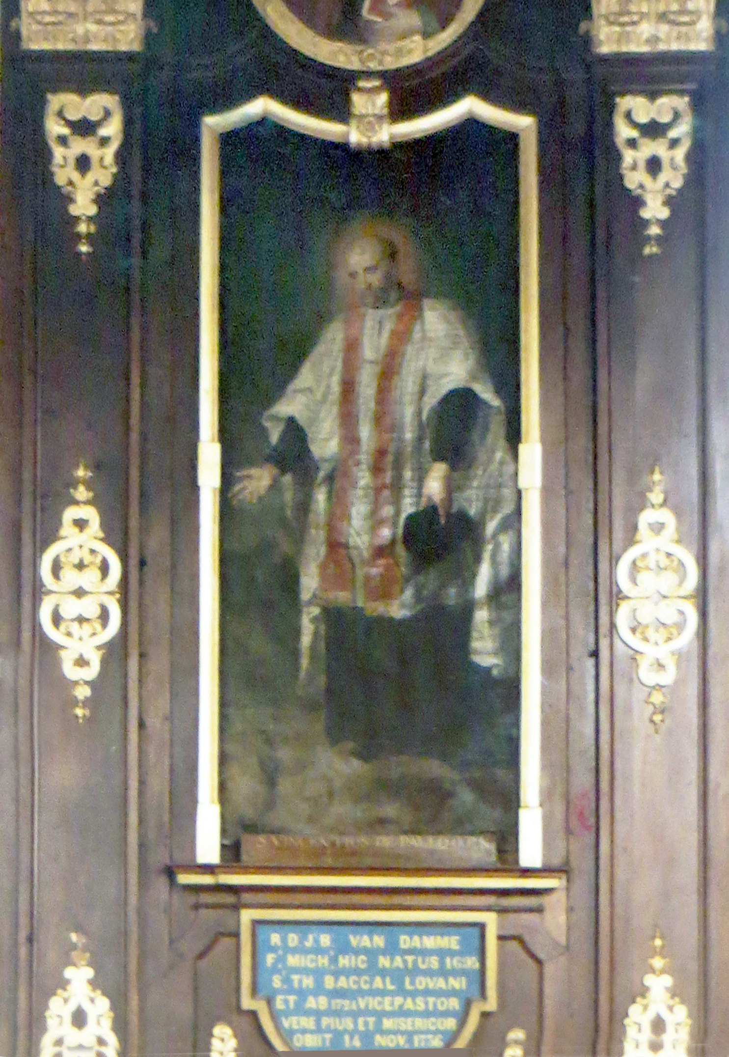 VdP, holding biretta, in cassock, ample surplice, red stoleInscription below was not for a Vincentian but a local priest.