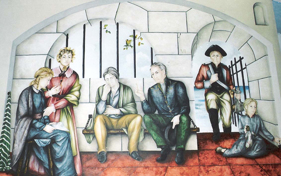 In the Lazaretto for quarantine, on their arrival - L to R: Elizabeth (seated), Amabilia Filicchi, William Seton, Antonio Filicchi, an Italian officer, Anna Maria Seton; courtesy Sr. Regina Bechtle SC