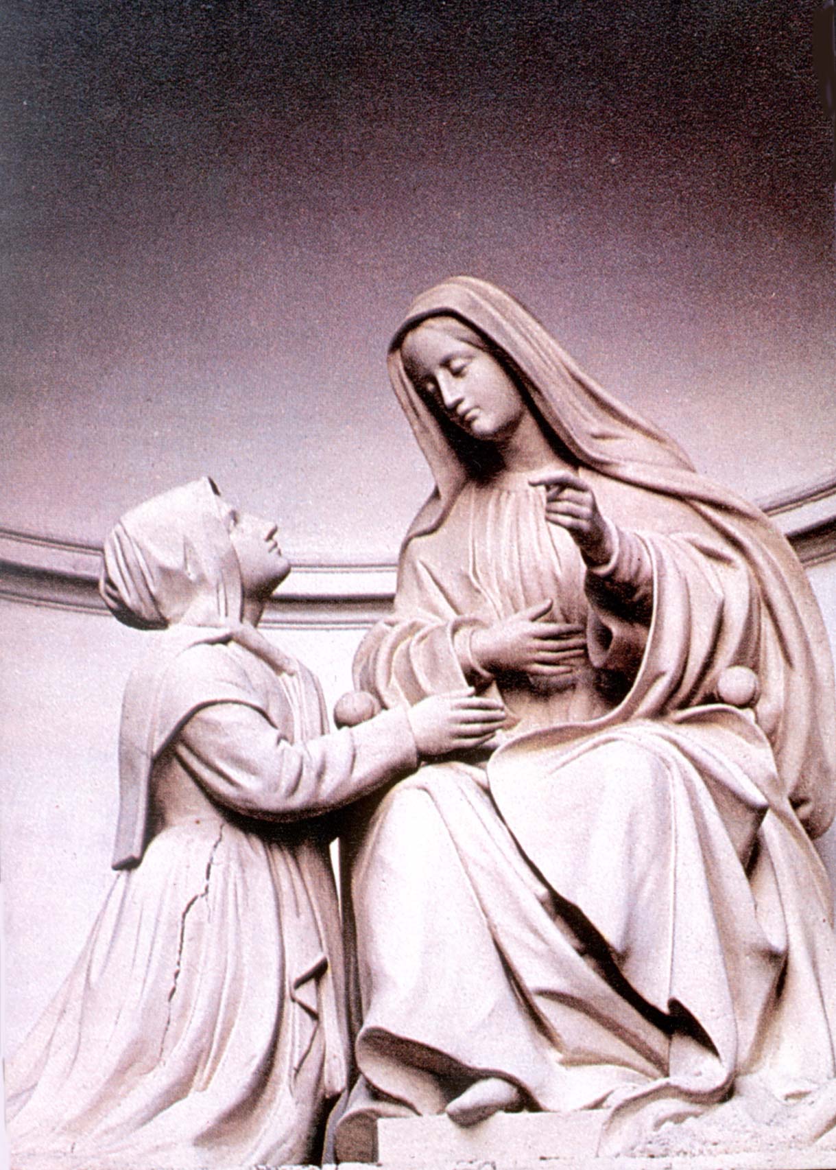 Catherine devant la Vierge Statue au dessus du porche de la Maison-Mre, 140 rue du Bac, Paris,