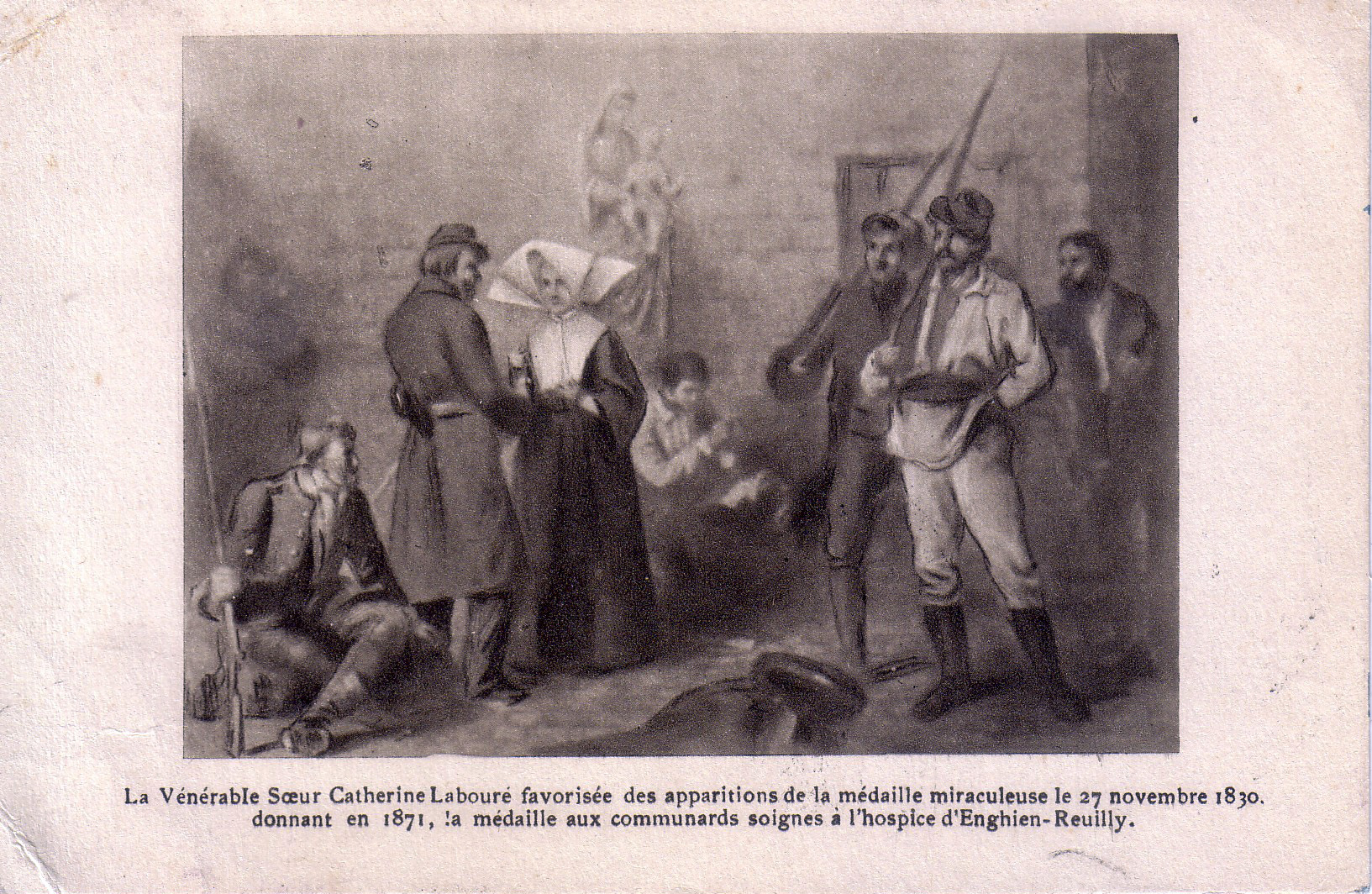 "The venerable Sr. C L, favored with the apparitions of the Miraculous Medal, 27 Nov 1830, giving in 1871 the medal to the communards cared for at the Enghien hospice in Reuilly." DePaul University collection