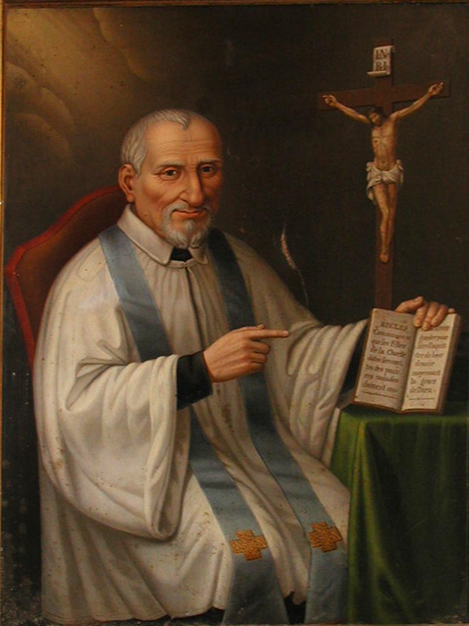 Oil on canvas, SVdP, seated, in cassock, surplice, blue stole, gesturing to open book of rules of Daughters of Charity; crucifix in background; original in provincial house of Daughters of Charity, Naples; I colori della carità, p. 216
