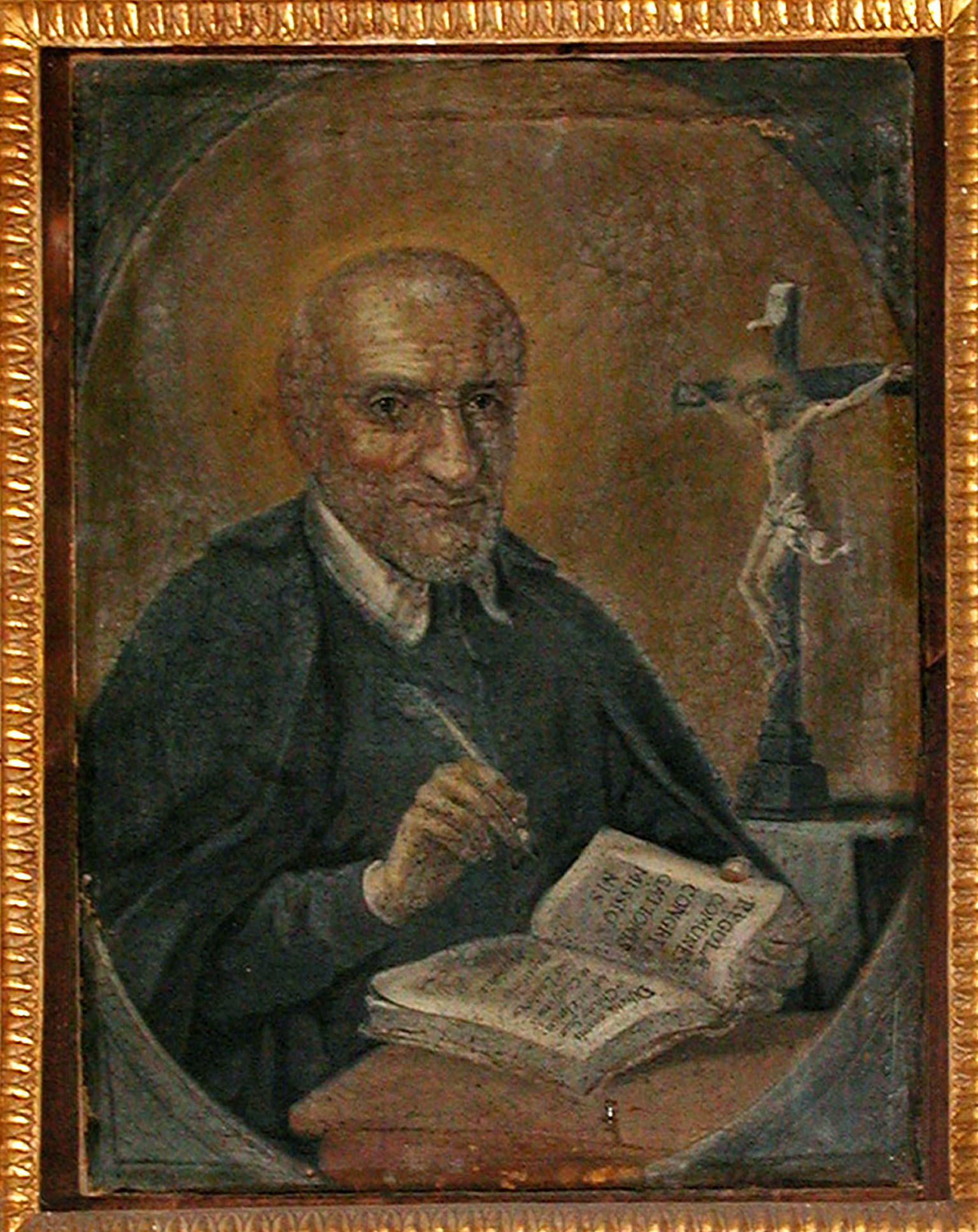 Oval painting, Vincent de Paul, seated, cassock, cape, writing Common Rules (Italian text), quill in hand, crucifix on table in background; original in Vincentian provincial house, via Vergini, Naples