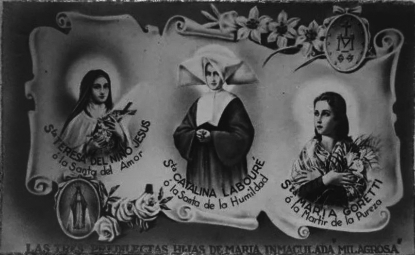Text: St. Therese of the Child Jesus, or the saint of love; St. Catherine Labouré, or the saint of humility; St. Maria Goretti, or the martyr of purity. The three chosen daughters of the Immaculate Mary, the miraculous. Internet image