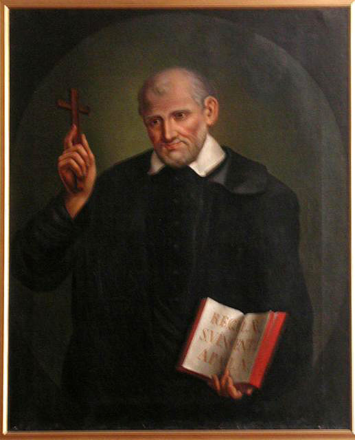 Oil on canvas; Vincent de Paul, standing, cassock, mantle, holding book (in Latin: Rules of St. Vincent de Paul), and cross; original in Vincentian central house, Ljubljana
