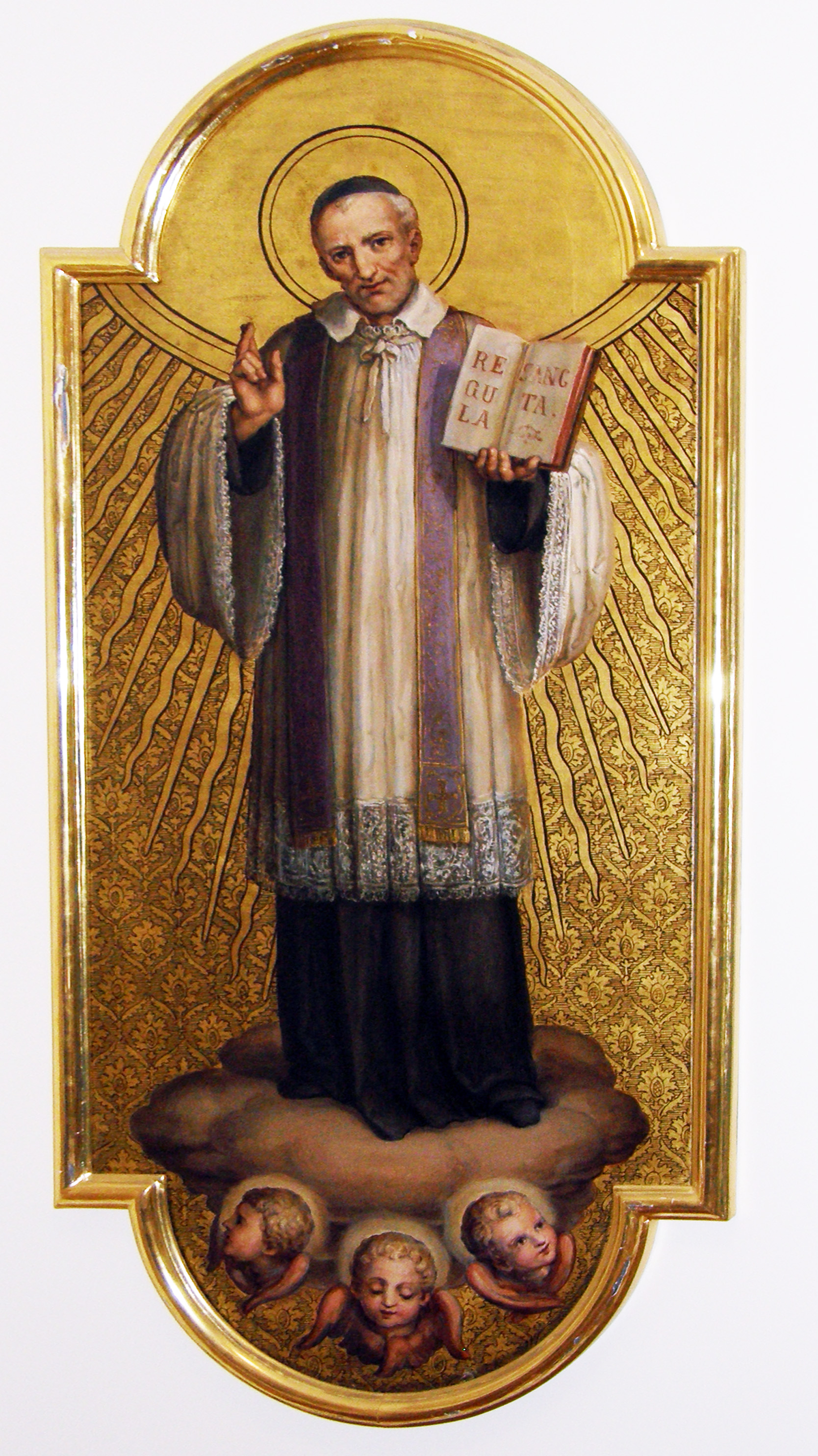 Vincent de Paul, standing on clouds, cassock, surplice, violet surplice, skullcap, halo, handl raised in blessing; holding "Holy Rule." Original in mother house, Sisters of Charity, Gumpendorf