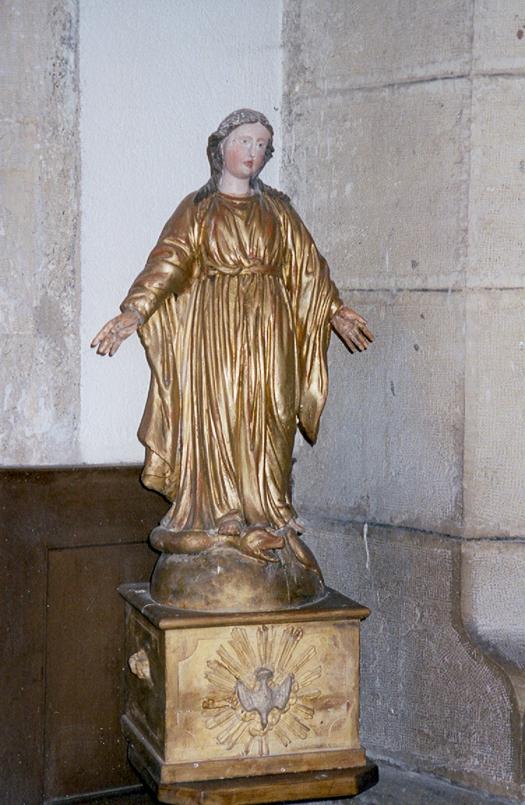 Wooden statue based on Bouchardon silver statue in St. Sulpice, Paris; model for the Miraculous Medal; original in parish church of Montgesty