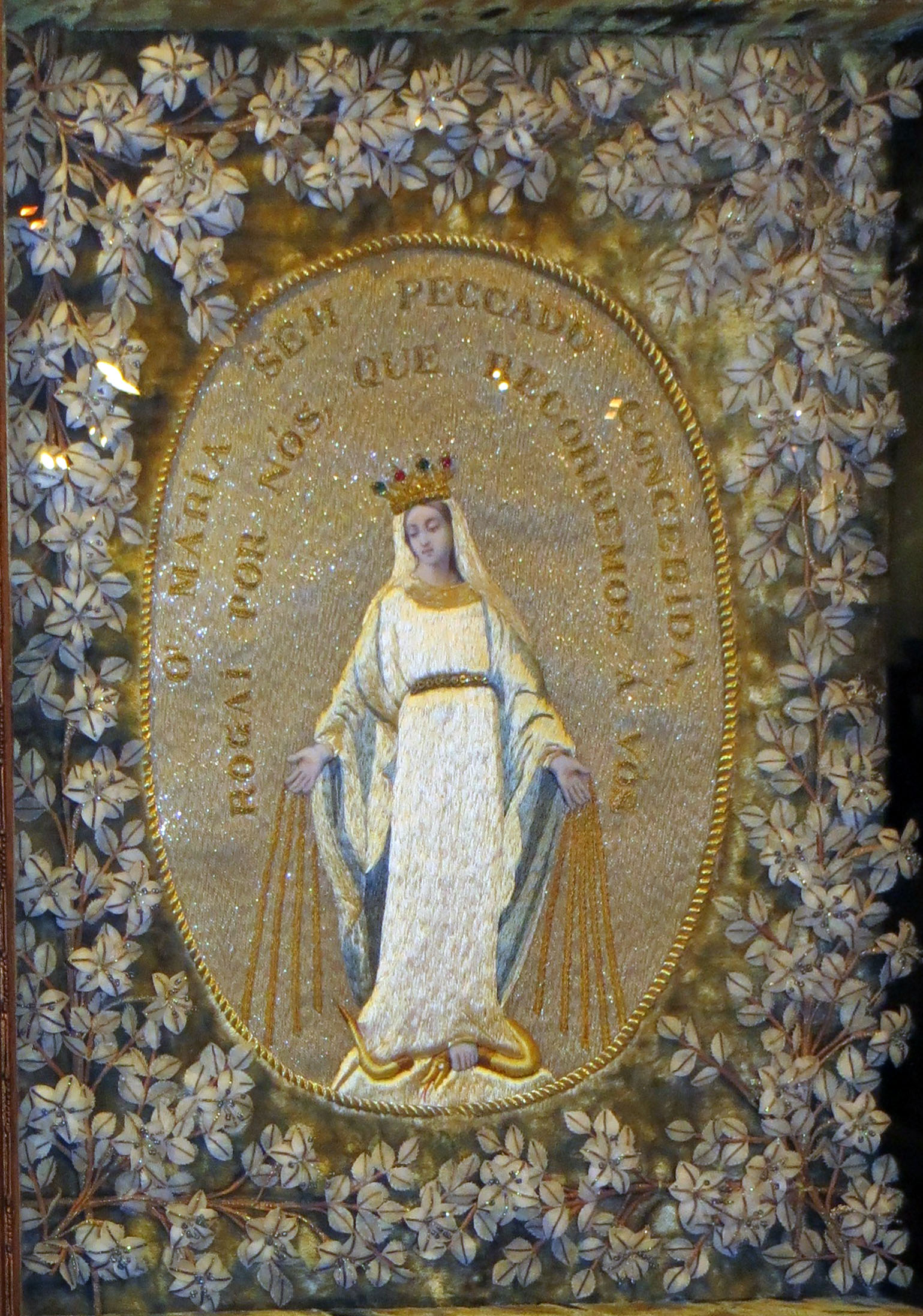 Embroidered and ornamented banner; Portuguese text