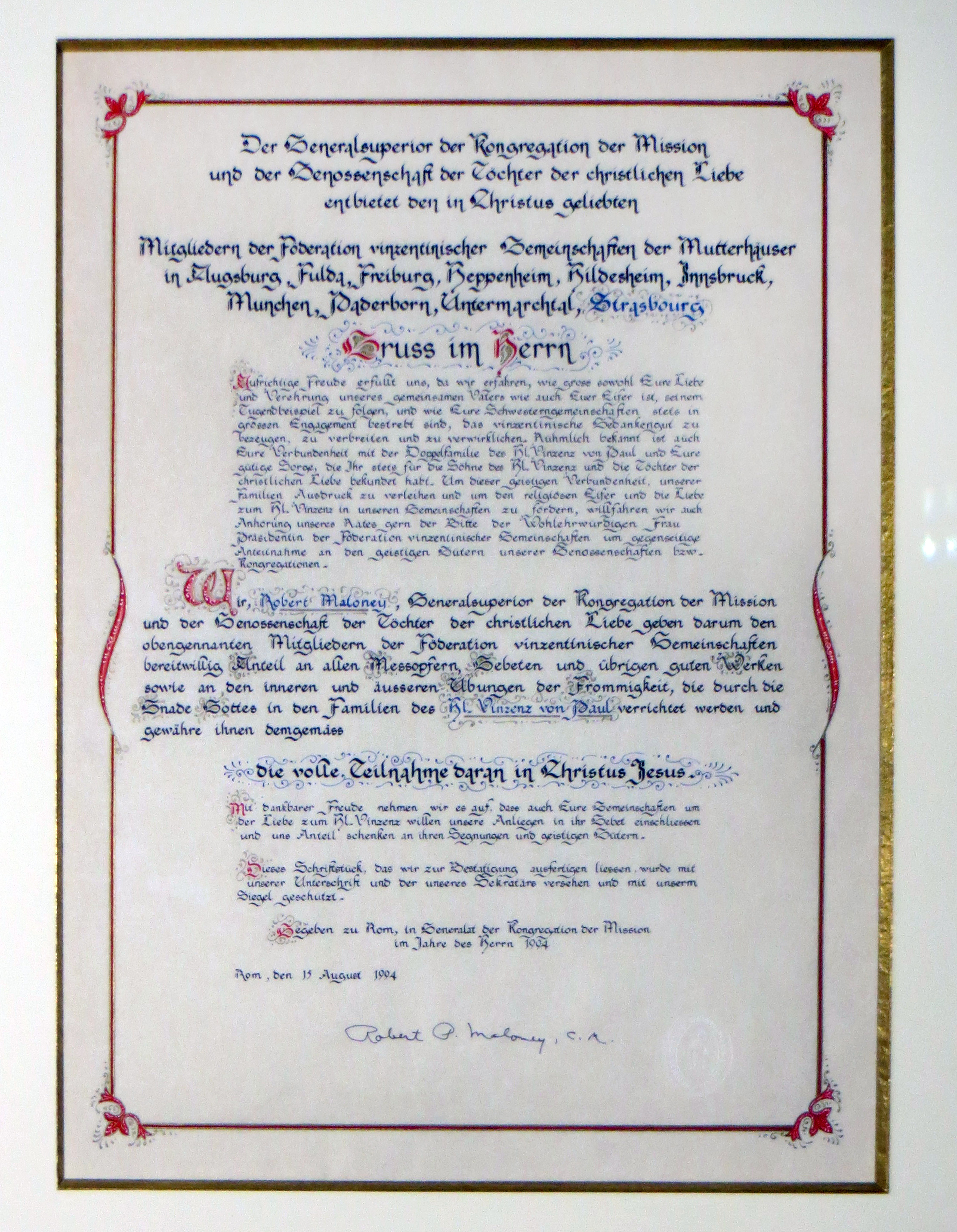 German text, granting affiliation in all spiritual matters with the Congregation of the Mission and the Daughters of Charity Original in Strasbourg mother house