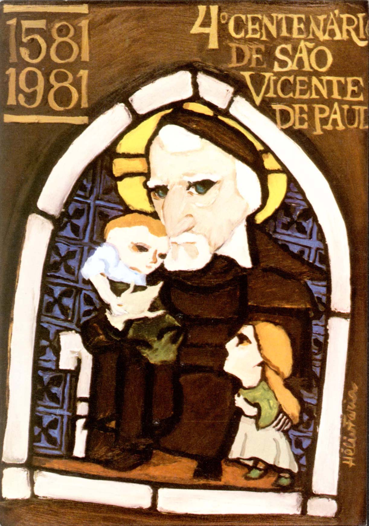 Publicity poster; Vincent de Paul and two children, stained glass style; Portuguese text