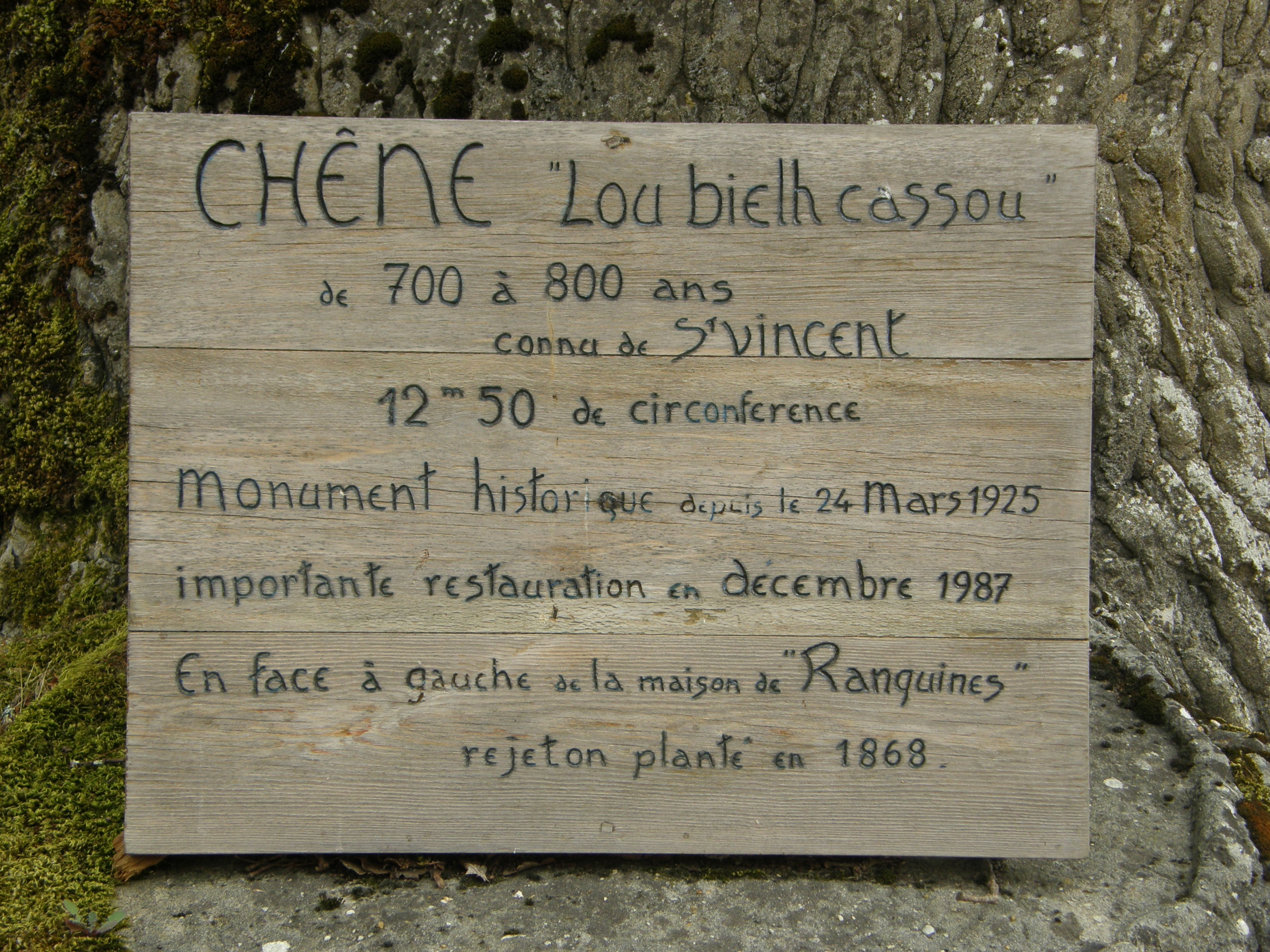Oak, called "Lou bielh cassou" [the beautiful oak], 700 to 800 years old, known by St. Vincent; 12.50 metters in circumference; historical monument... 1924; restoration, ... 1987; sprout planted in 1868 to the left of the Ranquines house