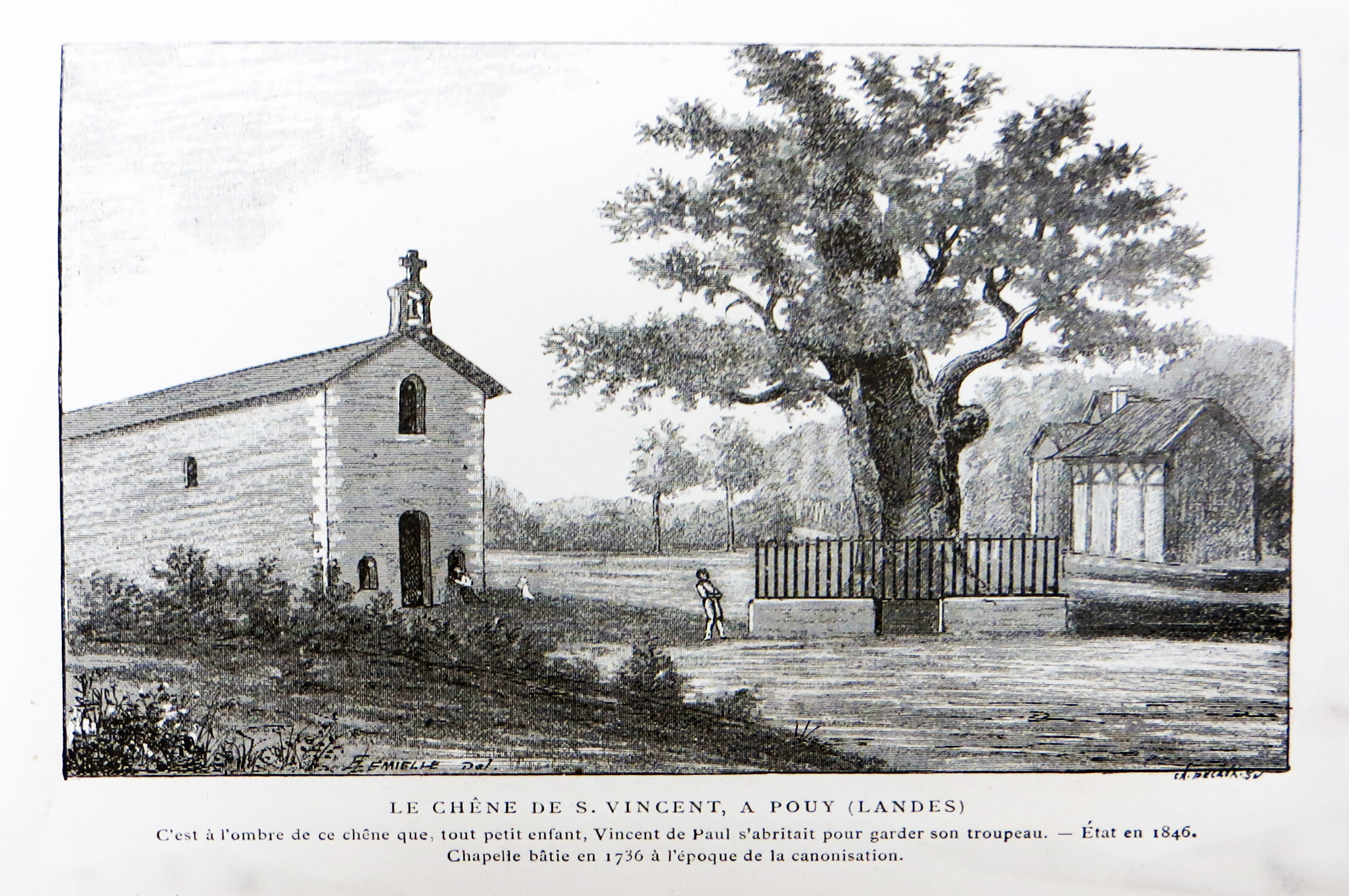 Chapel, oak, and a house (may not be Ranquines at right) Original in ACMP, Repertoire gégraphique