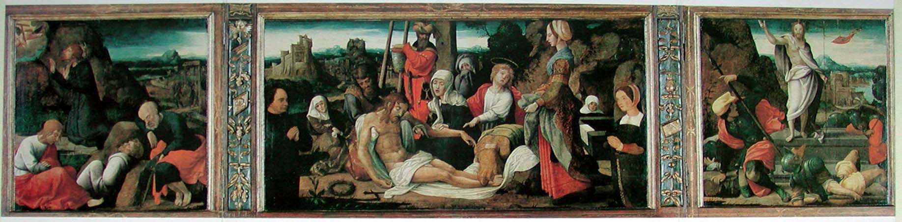 Châtillon-sur-Chalaronne. Triptych, Flemish school, first half 15th c., interior. Garden of Olives, Lamentation, Resurrection of Jesus Volets fermants extŽrieurs : Apparitions ˆ Marie et ˆ Marie-Madeleine.Ce triptyque Žtait autrefois dans