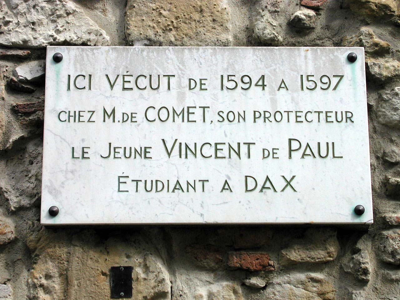 Text: Here, there lived from 1594 to 1597, in the home of M. de Comet, his protector, the young Vincent de Paul, a student in DaxDax, Comet plaque P3280008.JPG