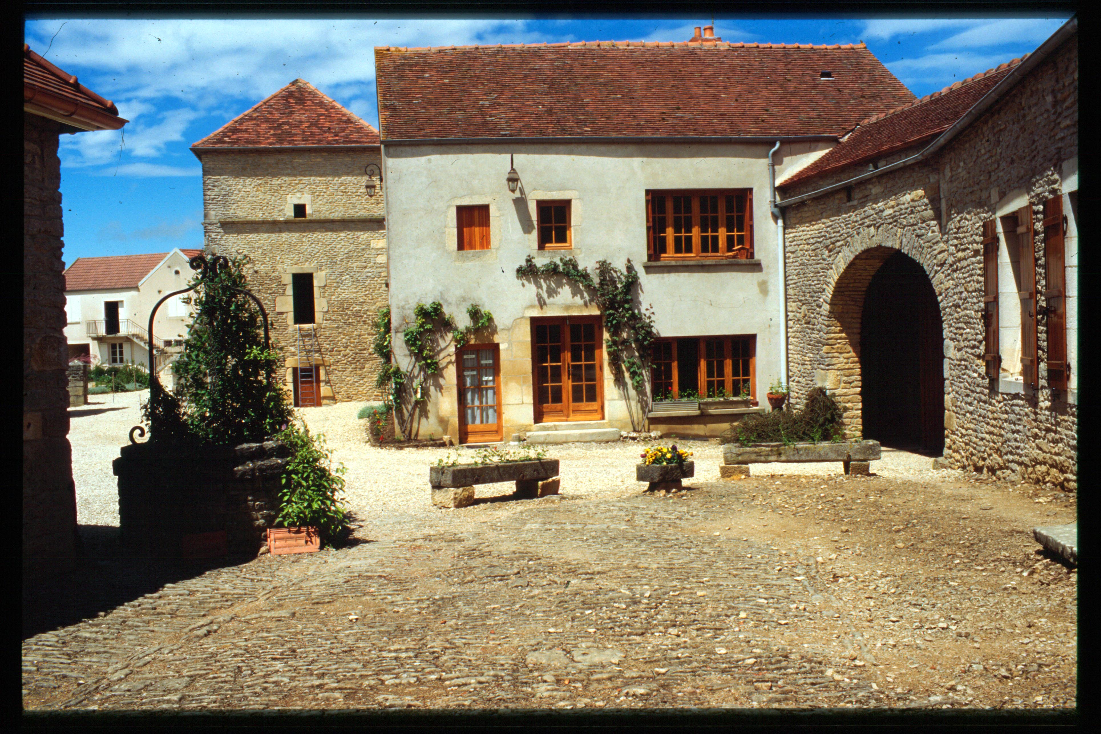 FAIN : cour intŽrieure de la ferme LabourŽ, - ˆ droite le poche d'entrŽe et les premires fentres de la salle, - dans le fond le colombier, - devant le puits,