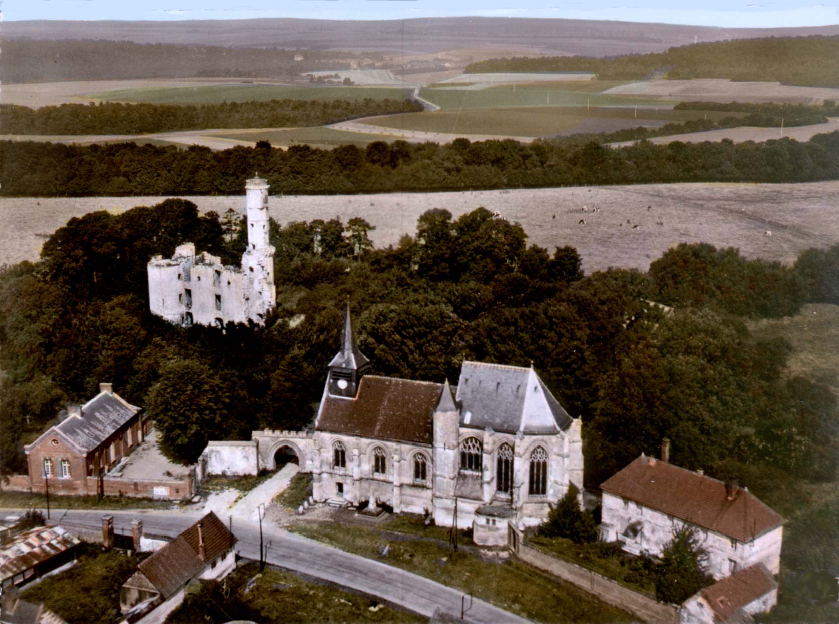 Folleville (Somme) Ruins of the Gondi castle, and the church, 1950-1960; right: school; left: rectory