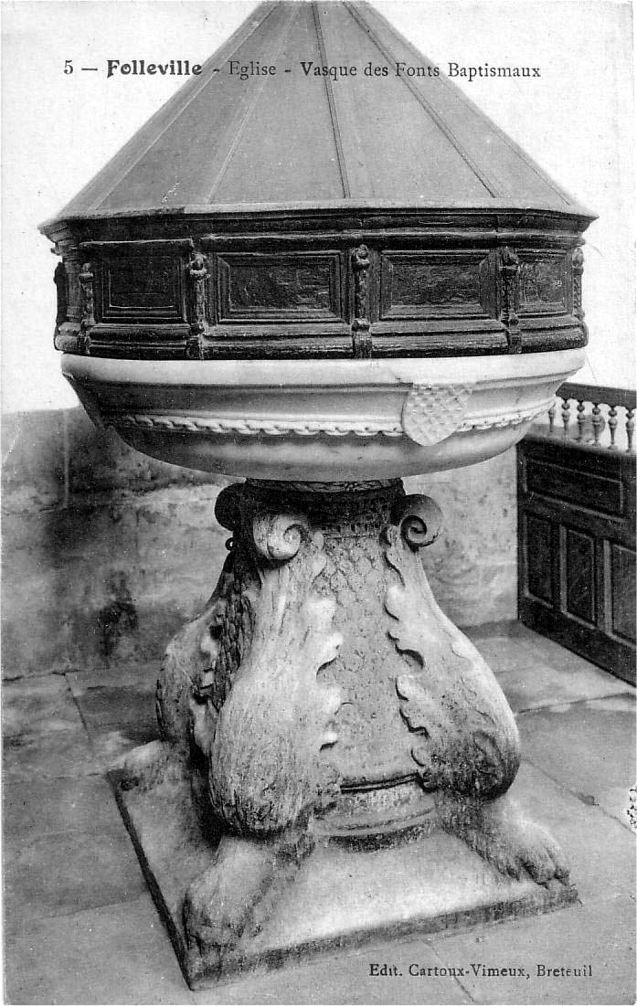 Folleville, post card, church int., baptismal font.jpg
