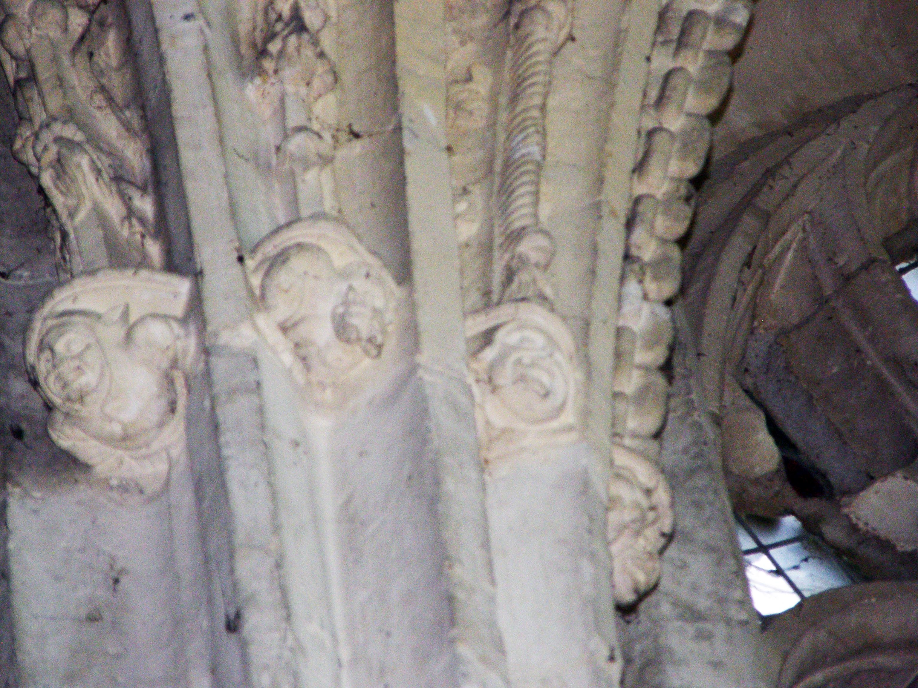 Carved heads, Franciscan rope motif; perhaps traces of color