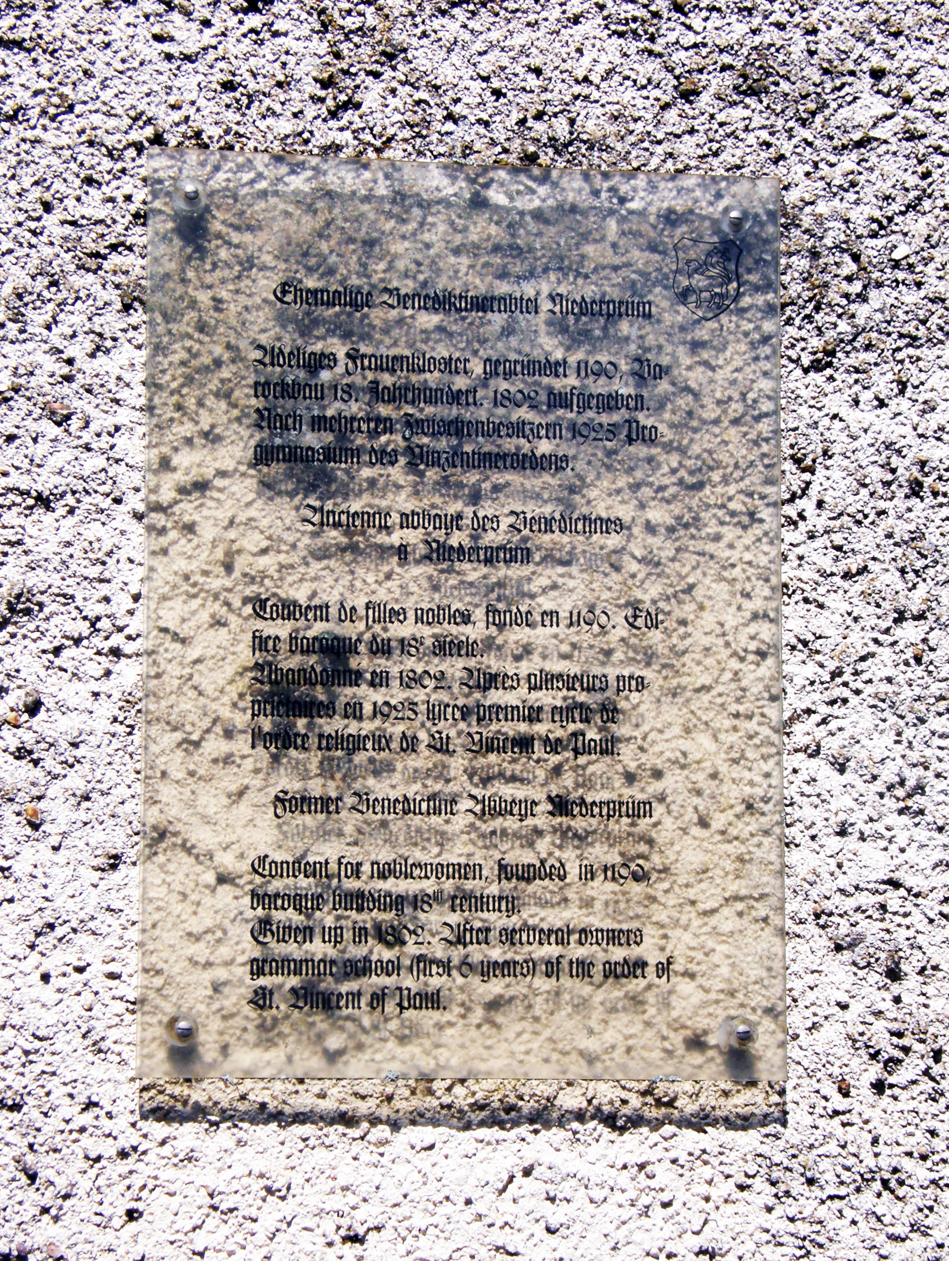 Text: Former Benedictine Abbey, Niederprum. Convent for noblewomen, founded in 1190; baroque building 18th century; given up in 1902. After several owners, grammar school (first 6 years) of the order of St. Vincent de Paul