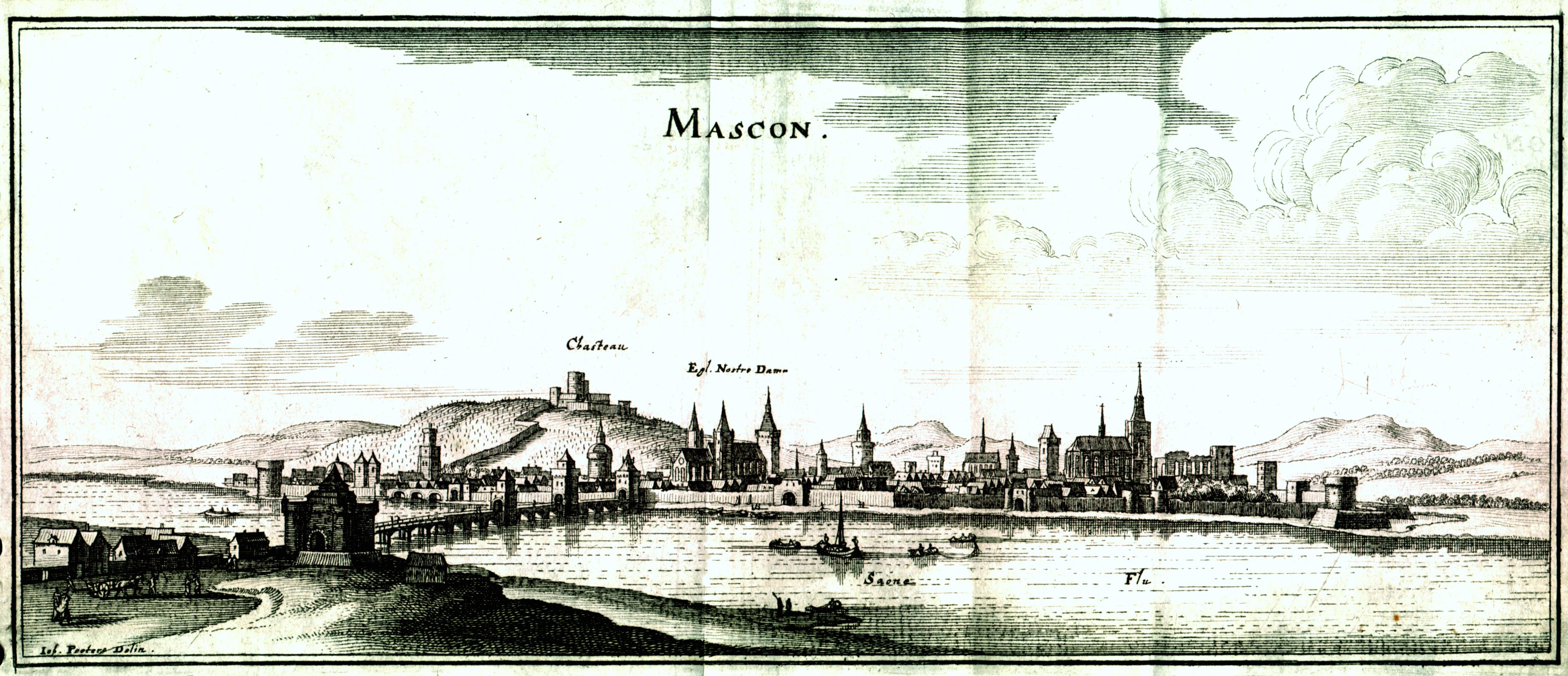 Vue de la ville de M‰con sur le bord de la Saone. Saint Vincent y organisa les secours aux mendiants. Gravure ancienne.