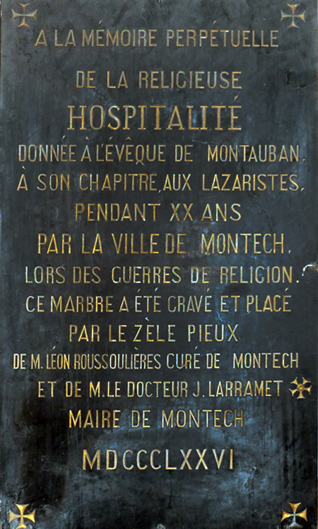 Summary text: In memory of the hospitality to the bishop of Montauban, his chapter, [and] the Lazarists for twenty years by Montech during the wars of religion. Plaque engraved and placed by the pious zeal of the pastor and the mayor of Montech, 1876