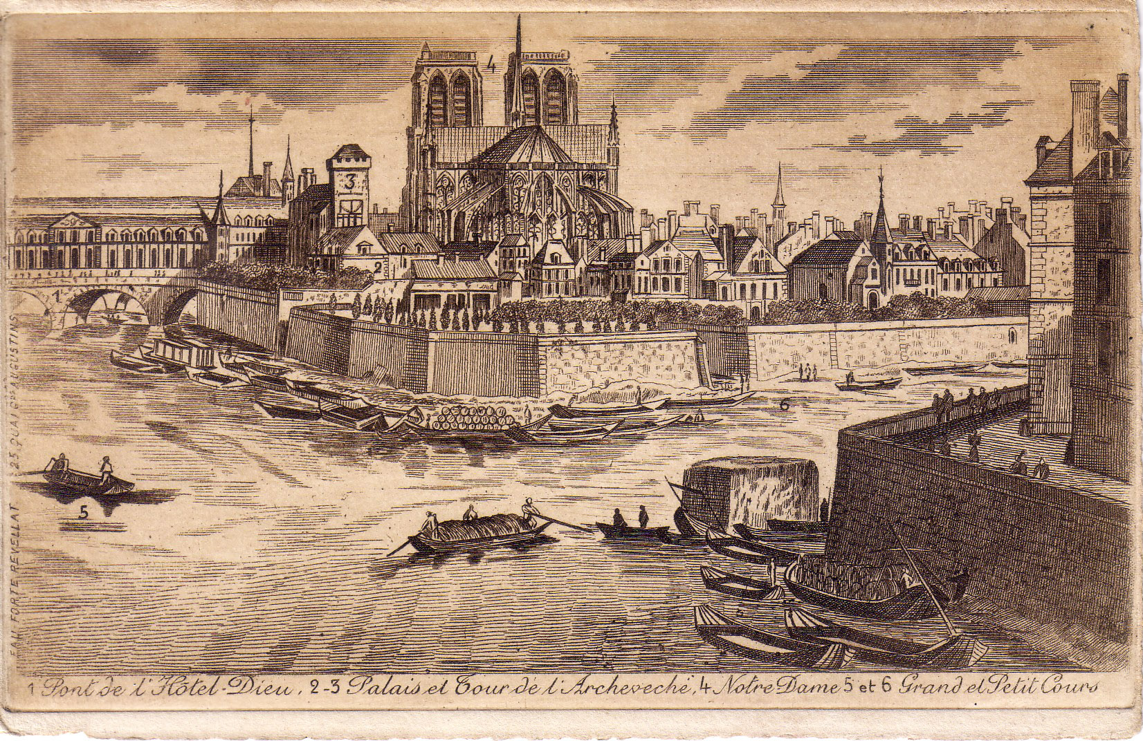 Roughly contemporary with St. Vincent de Paul, showing the Bridge of Hotel Dieu, the Palace and Court of the ardiocese; Notre Dame; and the two branches of the River Seine. -- Original at DePaul University.