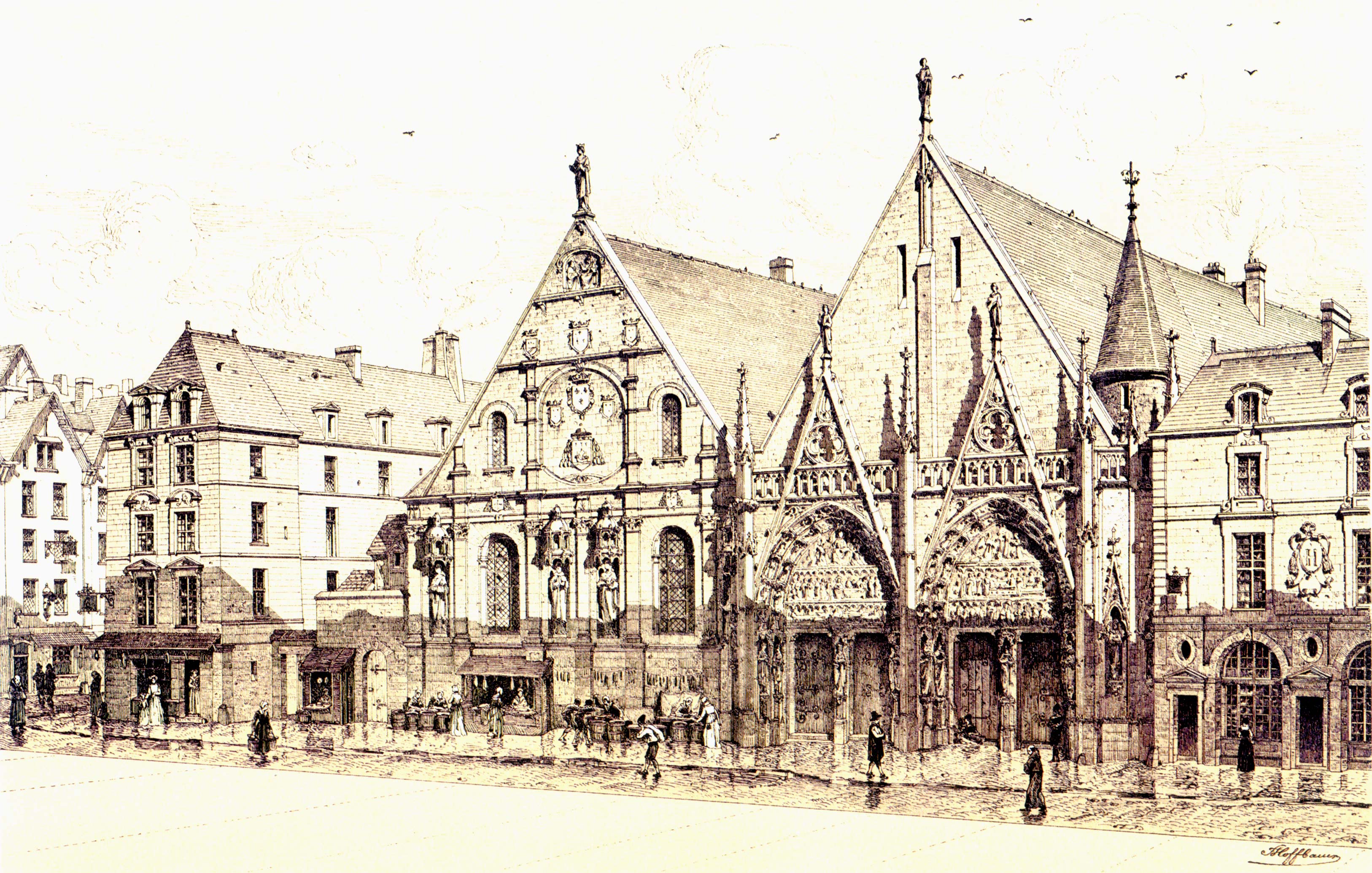 Paris: Entrée de l'Hôtel-Dieu, rue du marché-Palu, vers 1590. Dessin d'après le peintre T.G.H. HOFFBAUER, dans Paris à travers les âges