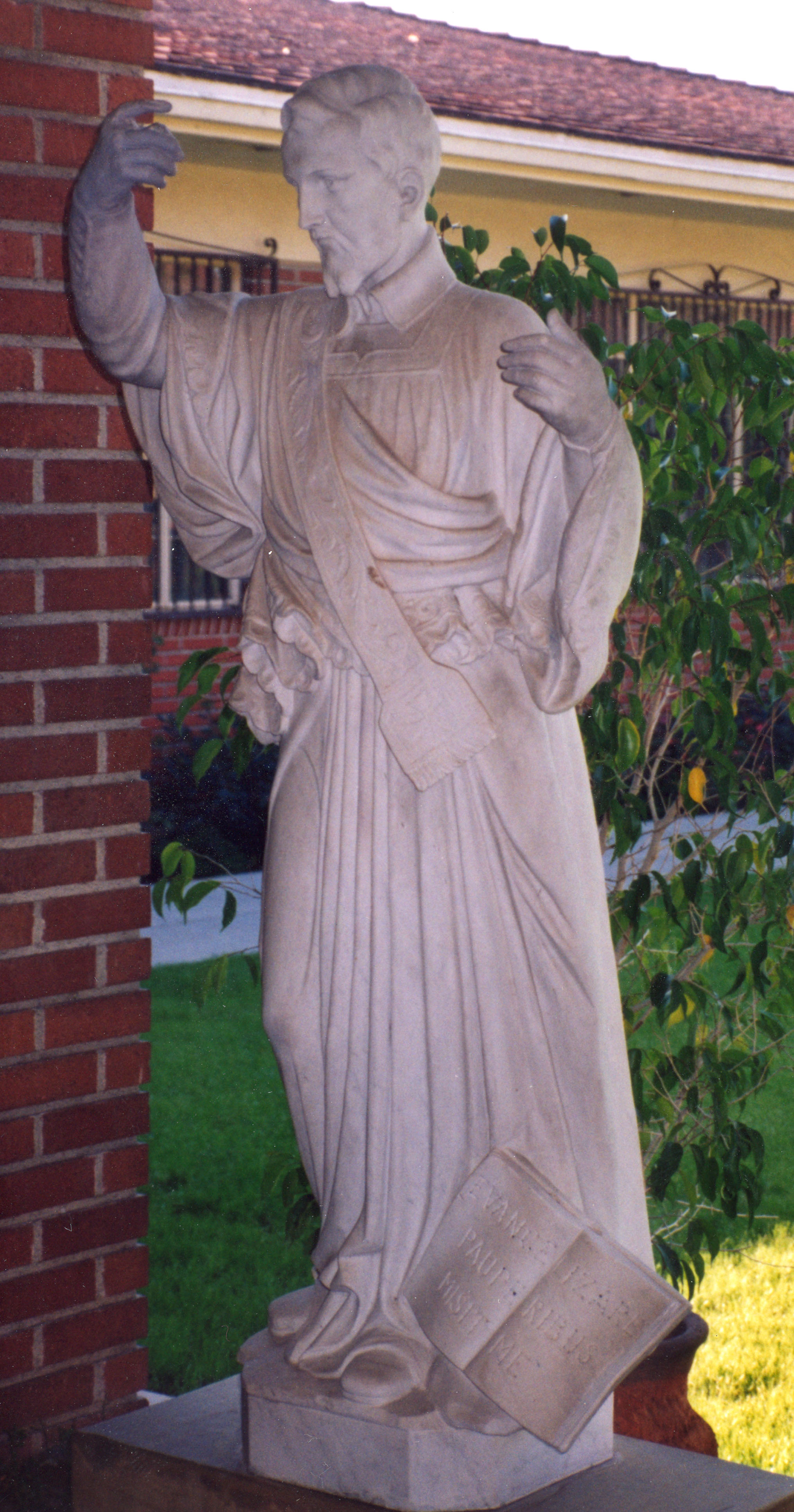Marble; Vincent de Paul standing, cassock, surplice, stole; crucifix missing; book at his feet; based on Bracci statue in Vatican; original at St. Vincent's Center, Montebello