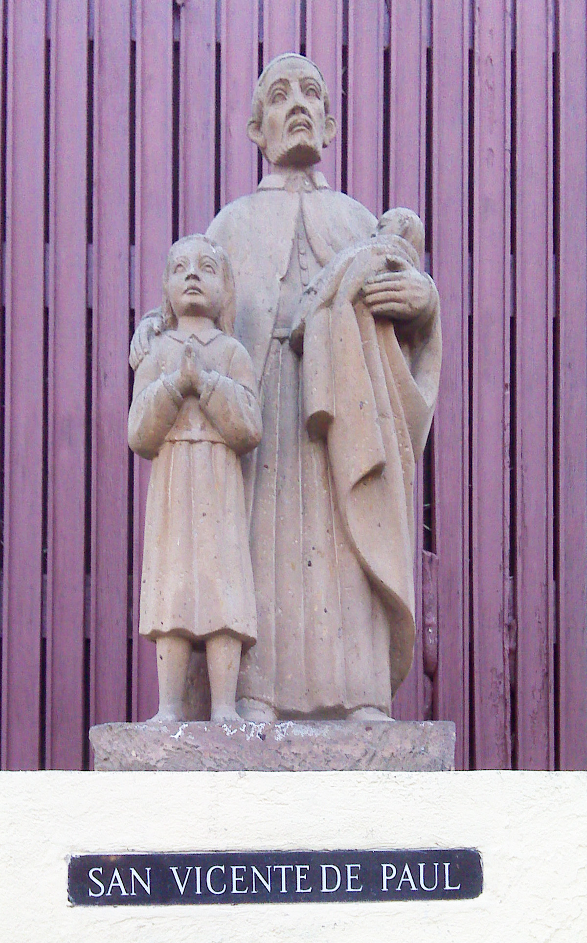 Plaster, Vincent de Paul, standing, cassock, cincture, cape, skullcap, with two children, Spanish text (photo by David Nations, CM); original at Our Lady of Talpa, Los Angeles