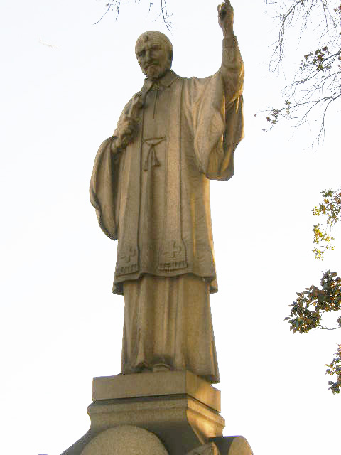 Carved stone, Vincent de Paul, standing, cassock, surplice, stole, holding crucifix, left arm raised; at Vincentian plot, Calvary Cemetery, Los Angeles