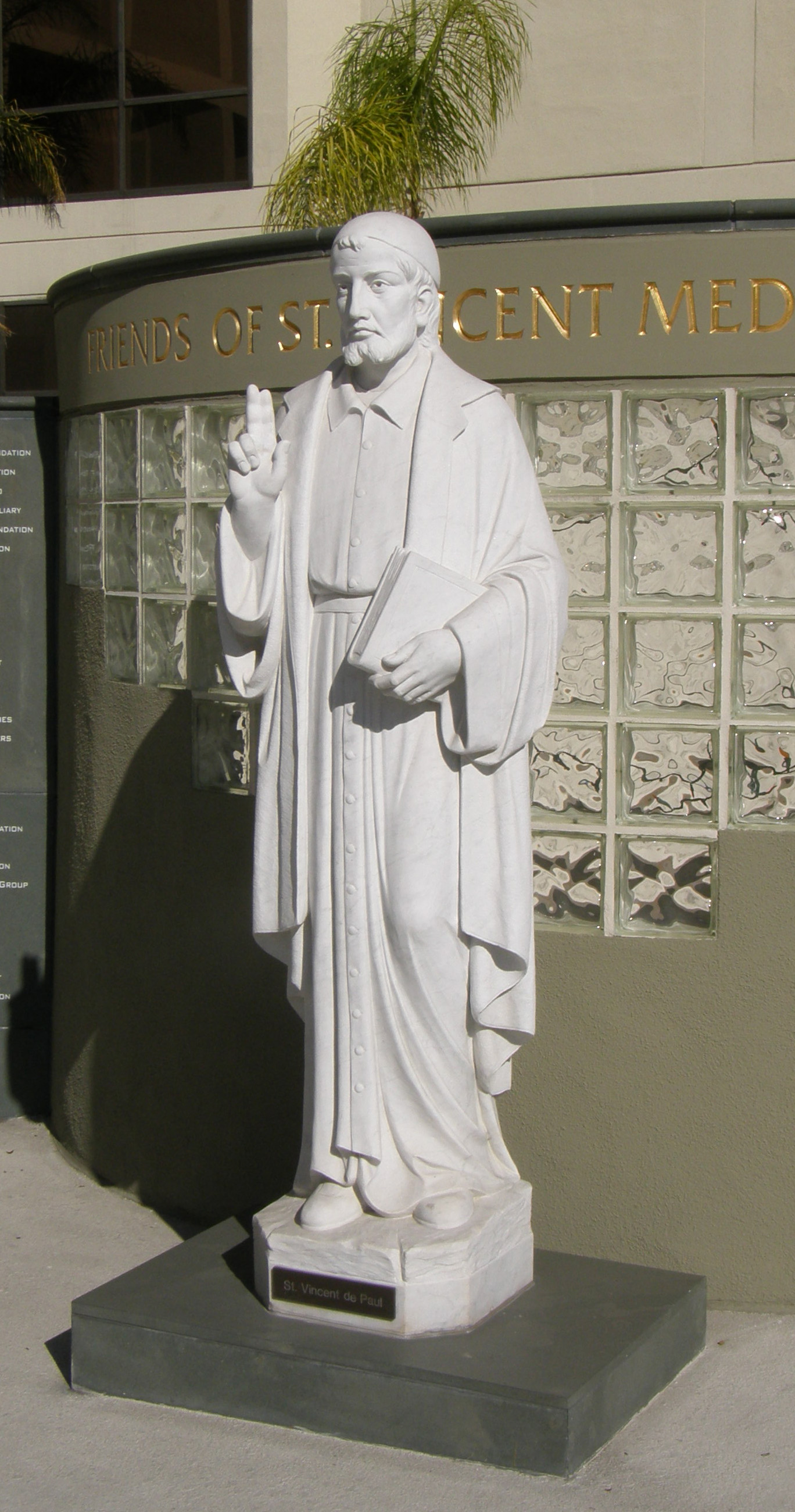 Marble; Vincent de Paul standing, cassock, cincture, mantle, skullcap; holding book; right hand raised in blessing; at St. Vincent Medical Center